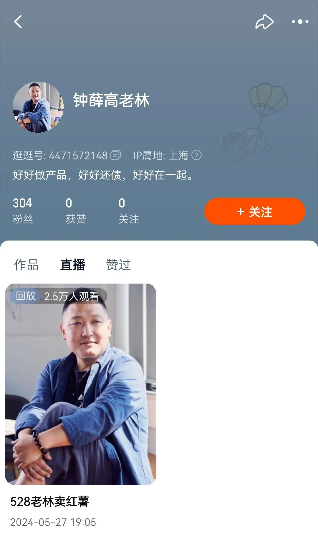 近日,钟薛高创始人林盛在淘宝开设直播账号“钟薛高老林”,签名写着“好好做产品,好好还债,好好在一起”。截至目前,该账号拥有304位粉丝。