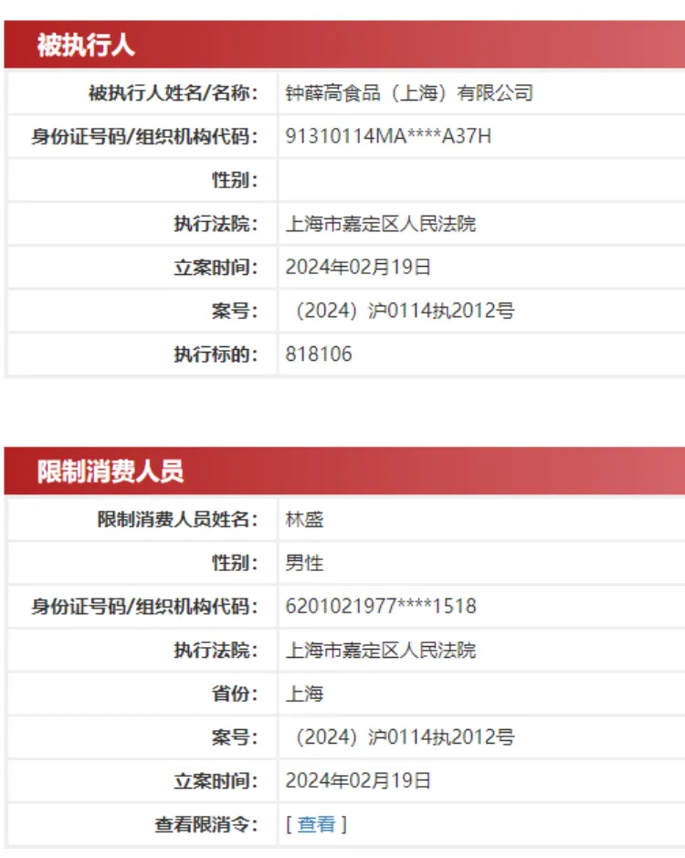 今年3月,据中国执行信息公开网,上海市嘉定区人民法院发布一则限制消费令,因“未按执行通知书指定的期间履行生效法律文书确定的给付义务”,钟薛高食品(上海)有限公司及其法定代表人林盛被限制高消费。