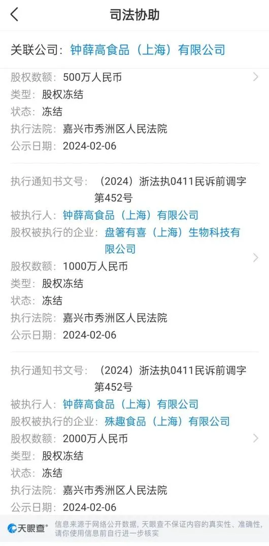 更早之前,据天眼查显示,今年2月,钟薛高食品(上海)有限公司新增3则股权冻结信息,涉及旗下3家公司,冻结股权数额分别为2000万人民币、1000万人民币、500万人民币,冻结期限自2024年2月6日至2027年2月5日。