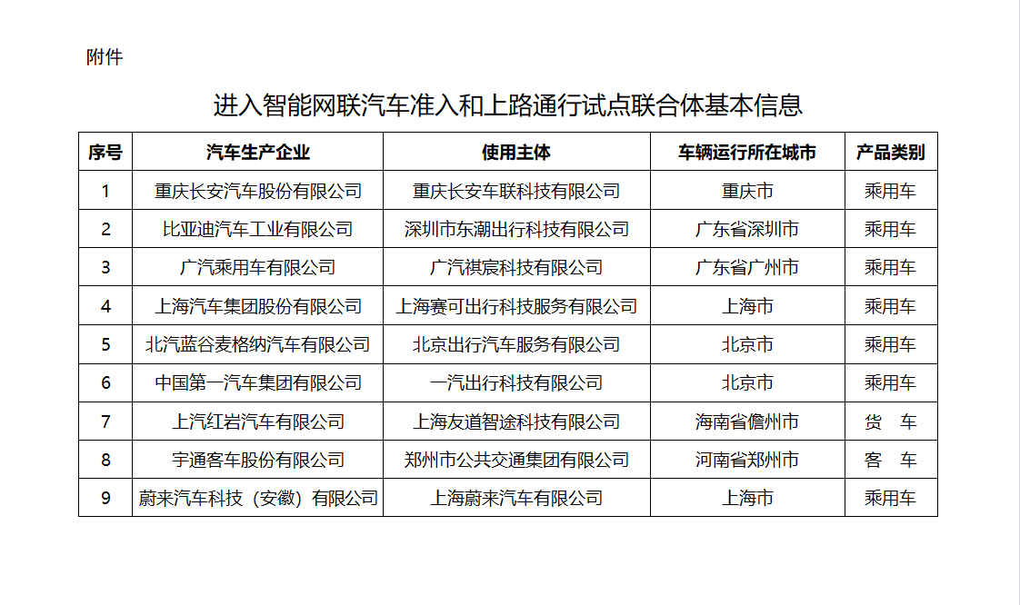 按照《关于开展智能网联汽车准入和上路通行试点工作的通知》(工信部联通装〔2023〕217号)有关工作安排,经汽车生产企业和使用主体组成联合体自愿申报、车辆拟运行城市人民政府同意、所在地省级主管部门审核推荐,工业和信息化部、公安部、住房城乡建设部、交通运输部(以下统称“四部门”)组织专家对首次集中申报的方案进行了初审和择优评审,研究确定了9个进入试点的联合体(基本信息见附件)。