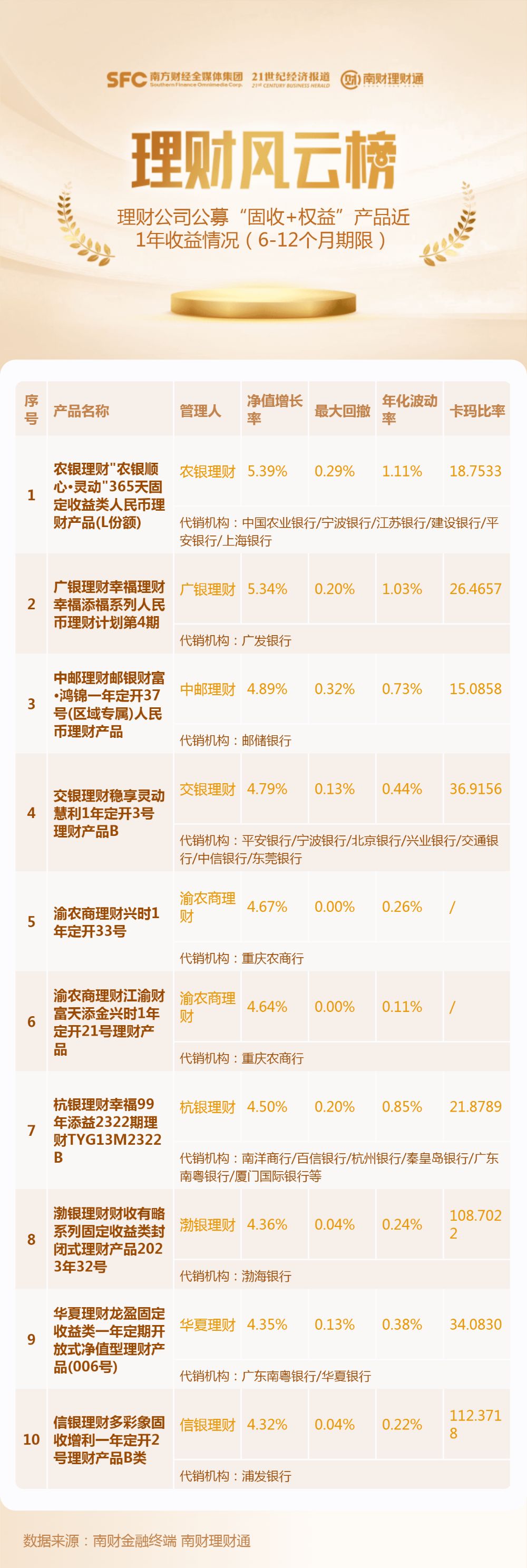 榜单筛选条件:理财公司发行的投资周期在6-12个月(含)的公募“固收+权益”产品,且近1年每个完整的自然月月末均为正收益,同系列同投资周期保留一只。
