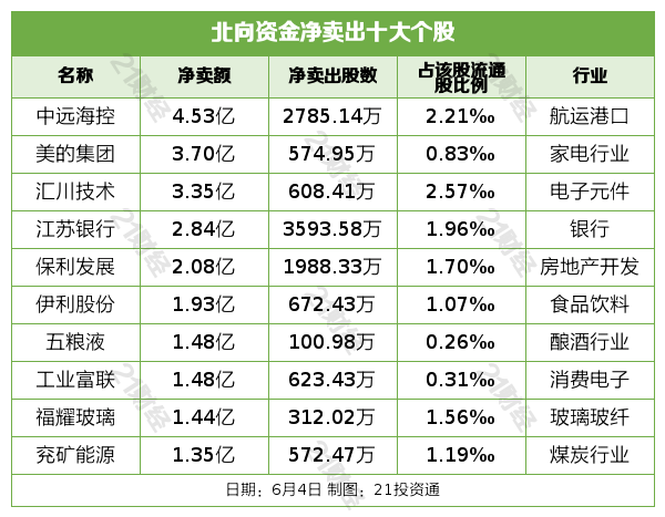 北向资金净卖出中远海控(601919.SH)、美的集团(000333.SZ)、汇川技术(300124.SZ)、江苏银行(600919.SH)、保利发展(600048.SH)居前,其中,中远海控被净卖出4.53亿元,美的集团被净卖出3.70亿元,汇川技术被净卖出3.35亿元,江苏银行被净卖出2.84亿元,保利发展被净卖出2.08亿元。