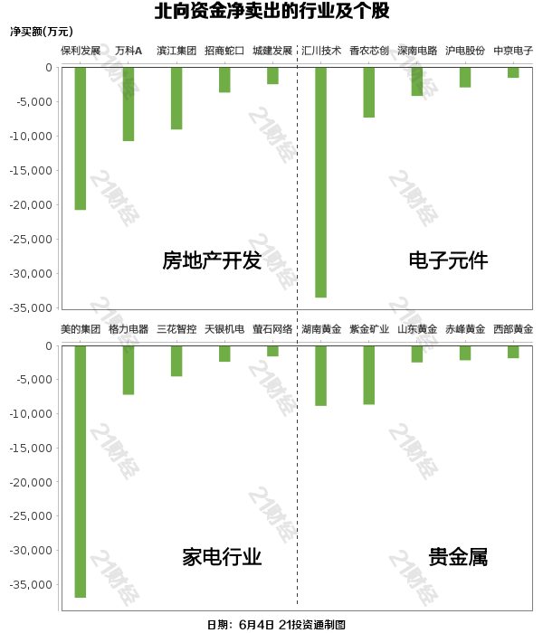 北向资金减持了27个行业,其中房地产开发最多,净卖出金额达4.17亿元,其次是电子元件行业,净卖出3.55亿元。