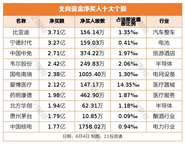 个股方面,北向资金净买入比亚迪(002594.SZ)、宁德时代(300750.SZ)、中国中免(601888.SH)、韦尔股份(603501.SH)、国电南瑞(600406.SH)居前,其中,比亚迪被净买入3.71亿元,宁德时代被净买入3.27亿元,中国中免被净买入2.71亿元,韦尔股份被净买入2.42亿元,国电南瑞被净买入2.38亿元。