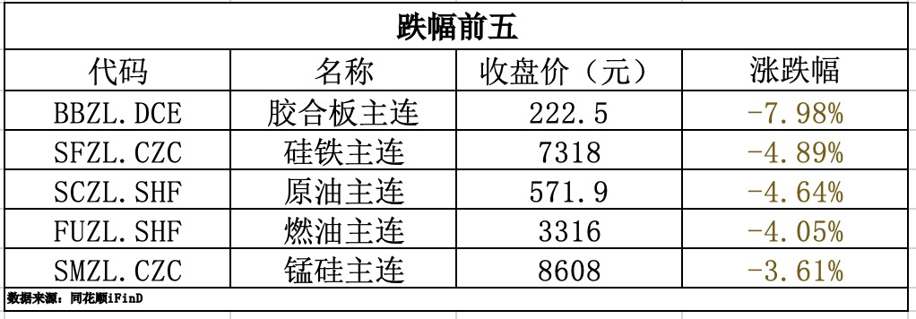 4日,国内商品期货收盘,多数品种下跌。跌幅方面,硅铁跌近5%,原油、燃油跌超4%,锰硅跌超3%;涨幅方面,欧线集运涨超9%,再创收盘新高,尿素涨近2%,沪铅涨超1%,玻璃、沪铝等小幅上涨。
