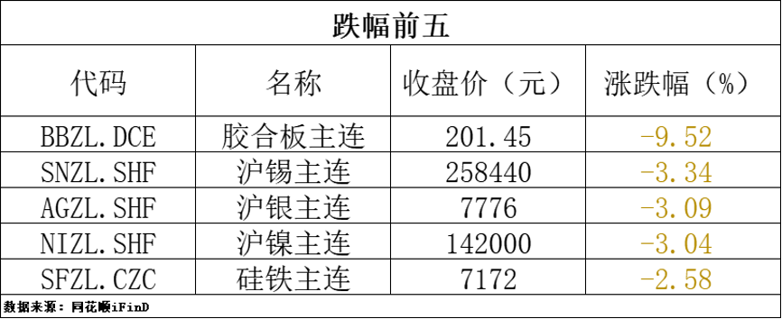 6月5日,国内商品期货多数收跌,胶合板跌超9%,沪锡、沪银、沪镍跌超3%,硅铁跌超2%;涨幅方面,欧线集运、合成橡胶、棉花、菜粕、尿素涨超1%。