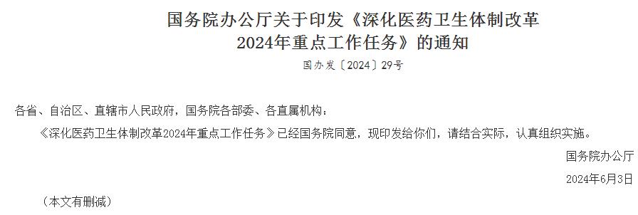 6月6日消息,国务院办公厅印发《深化医药卫生体制改革2024年重点工作任务》。其中提到: