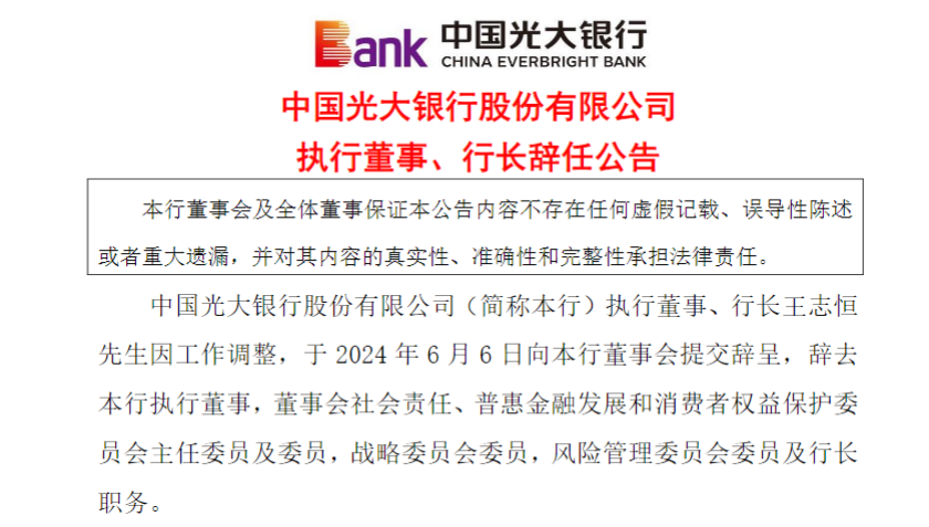 6月6日,光大银行(601818.SH)发布公告称,执行董事、行长王志恒因工作调整,辞去光大银行执行董事、行长等职务。