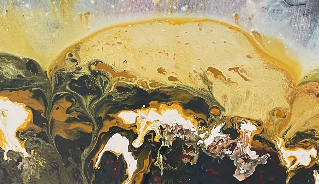 高大钢运用其创立的飘色法,将画面的色彩处理得既丰富又和谐。色彩在画布上自由流动,把投色变冲色、把偶然变必然、把自动变能动,把华盖叶贯与翠绿完美融合,如同天地间的气息,灵动而意幻。这种处理方式不仅使画面充满了动感,也更好地体现了道家哲学中“无为而无不为”的精神内涵。