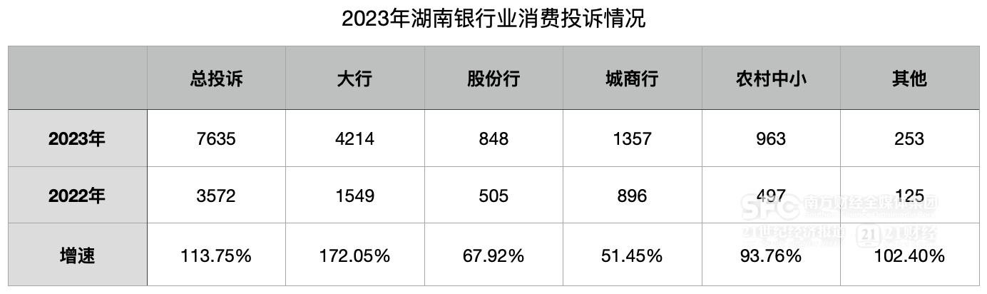 对比来看,2023年湖南银行业机构处理消费投诉件数较2022年增长113.75%,其中大型银行投诉量增速最高,达172.05%,股份行投诉量增速为67.92%,城商行投诉量增速为51.45%,农村中小金融机构投诉量增速为93.76%,其他银行业金融机构投诉量增速为102.40%。