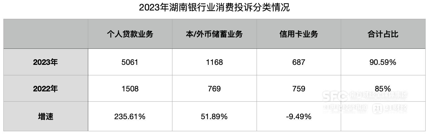 通报显示,2023年湖南银行业机构处理消费投诉类型主要集中在个人贷款类业务、本/外币储蓄业务、信用卡业务三类,投诉量分别为5061件、1168件、687件,占总投诉量的比重为90.59%。
