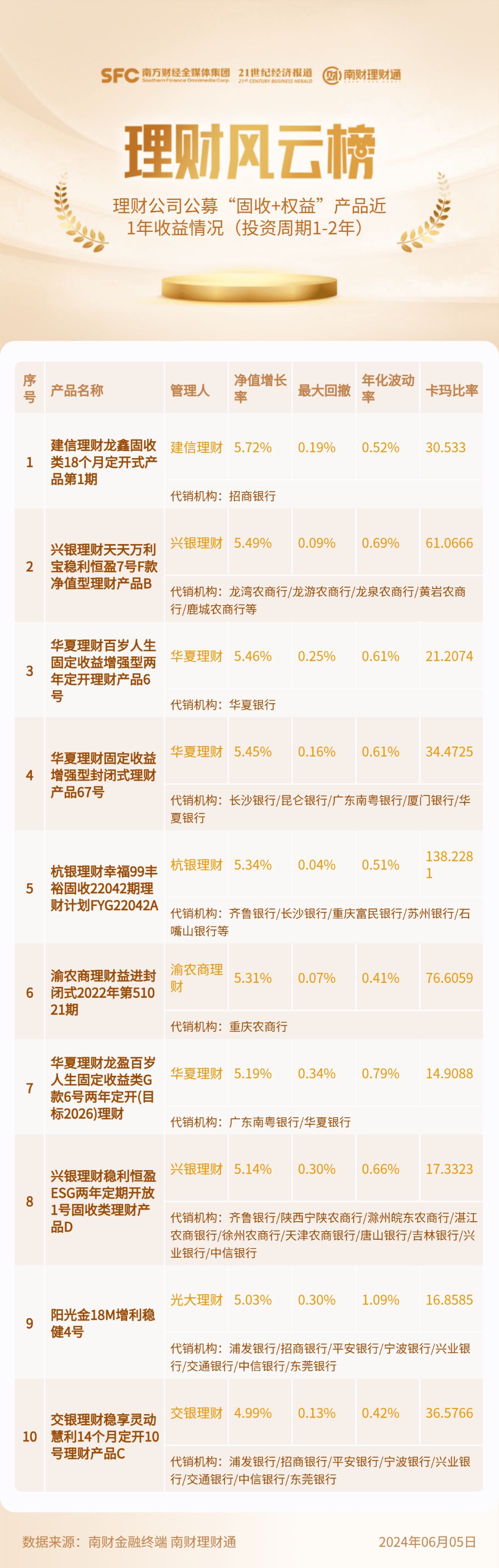 榜单筛选条件:理财公司发行的投资周期在1-2年(含)的公募“固收+权益”产品,且近1年每个完整的自然季季末均为正收益,同系列同投资周期保留一只。