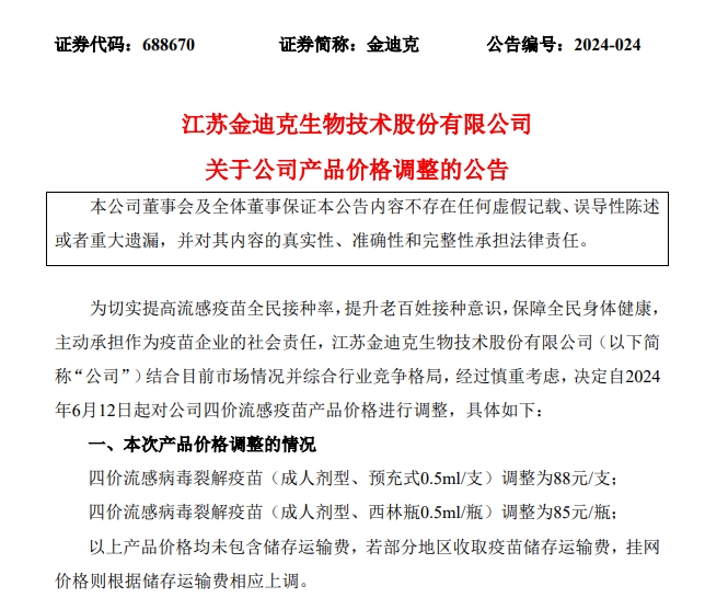6月12日晚,金迪克(688670.SH)发布公告称,结合目前市场情况并综合行业竞争格局,经过慎重考虑,决定自2024年6月12日起对公司四价流感疫苗产品价格进行调整。产品价格具体调整情况如下: