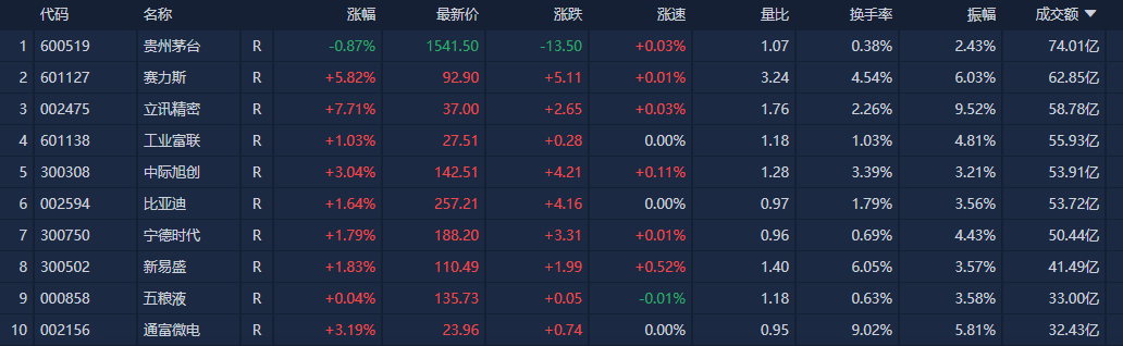 个股方面,贵州茅台成交额74.01亿元居首,赛力斯、立讯精密、工业富联成交额靠前。