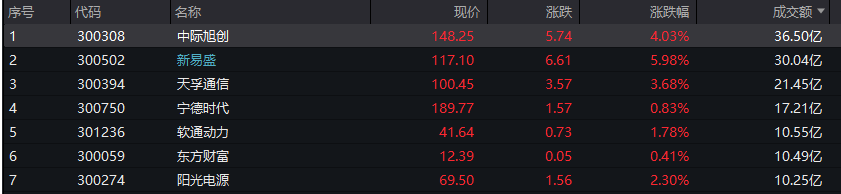 沪深两市半日成交额4523亿,较上个交易日同期缩量378亿。个股方面,Wind数据显示,中际旭创成交额36.50亿元居首,新易盛、天孚通信成交额分别为30.04亿元和21.45亿元。