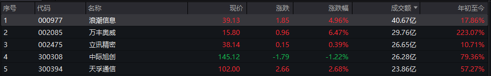 沪深两市半日成交额4485亿,较上个交易日同期缩量38亿。个股方面,Wind数据显示,浪潮信息成交额40.67亿元居首,万丰奥威成交额为29.76亿元,立讯精密、中际旭创和天孚通信的成交额均在20亿元以上。