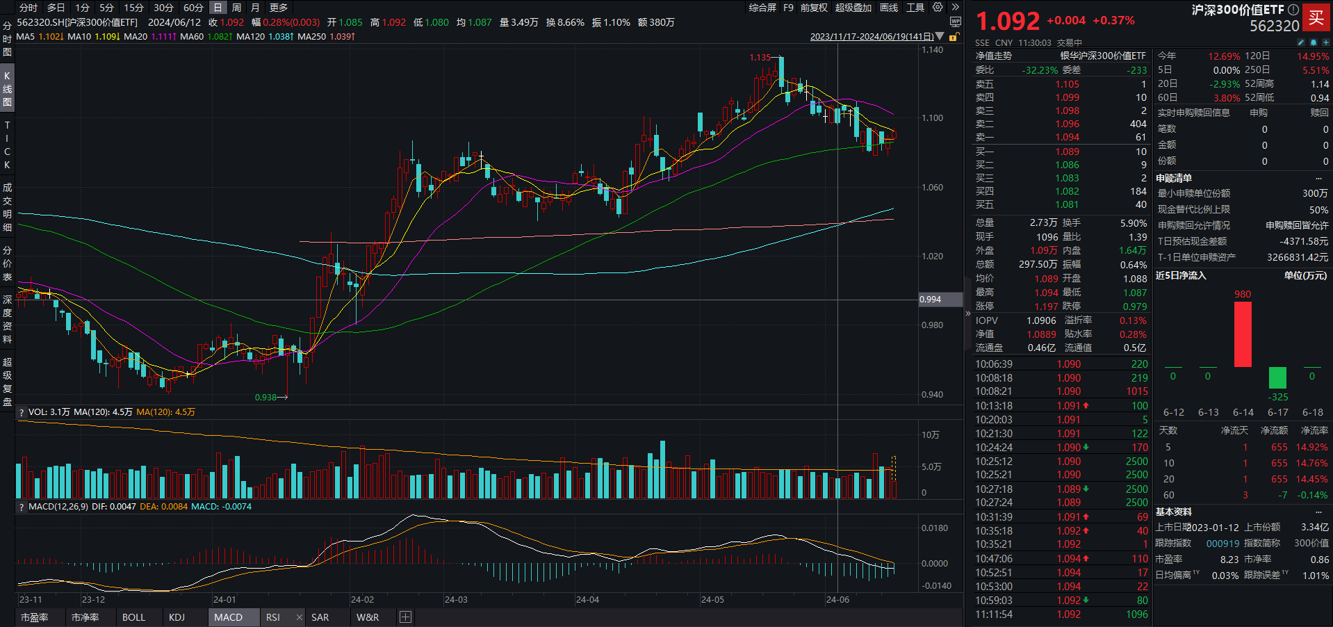 跟踪该指数的沪深300价值ETF(562320)早盘收涨0.37%,交投较为活跃,换手率近6%,溢折率为0.13%。