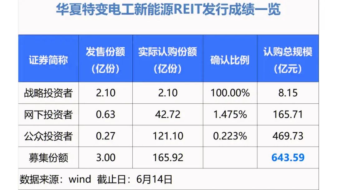 6月16日,华夏特变电工新能源REIT宣布,募集活动提前结束,公众发售配售比例仅为0.223%,创下新低。