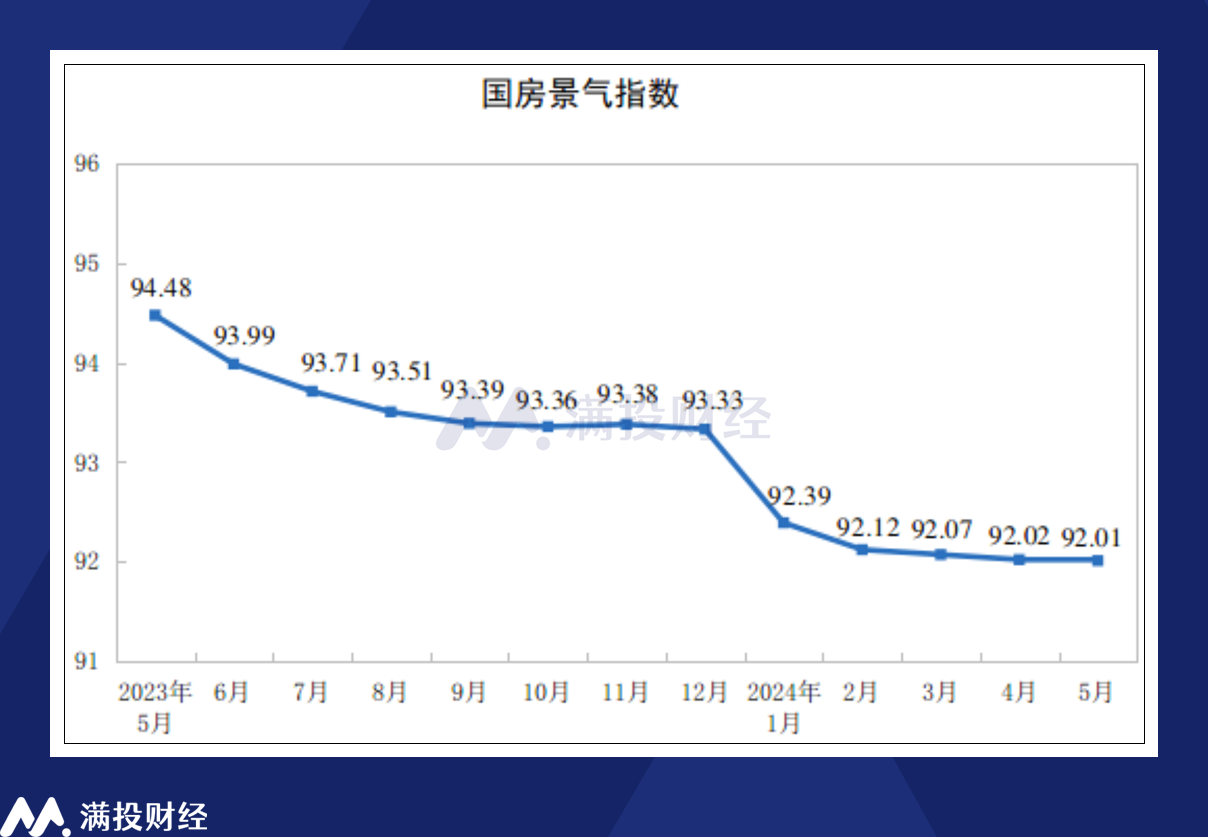 5月份,房地产开发景气指数(简称“国房景气指数”)为92.01,前值为92.02,景气度略有回升,但整体仍在历史低位徘徊。5月末,商品房待售面积74256万平方米,同比增长15.8%。尽管市场迎来更为宽松的政策环境,但房地产去化仍旧困难,政策实施到房地产市场企稳还需要时间。