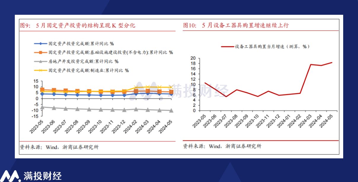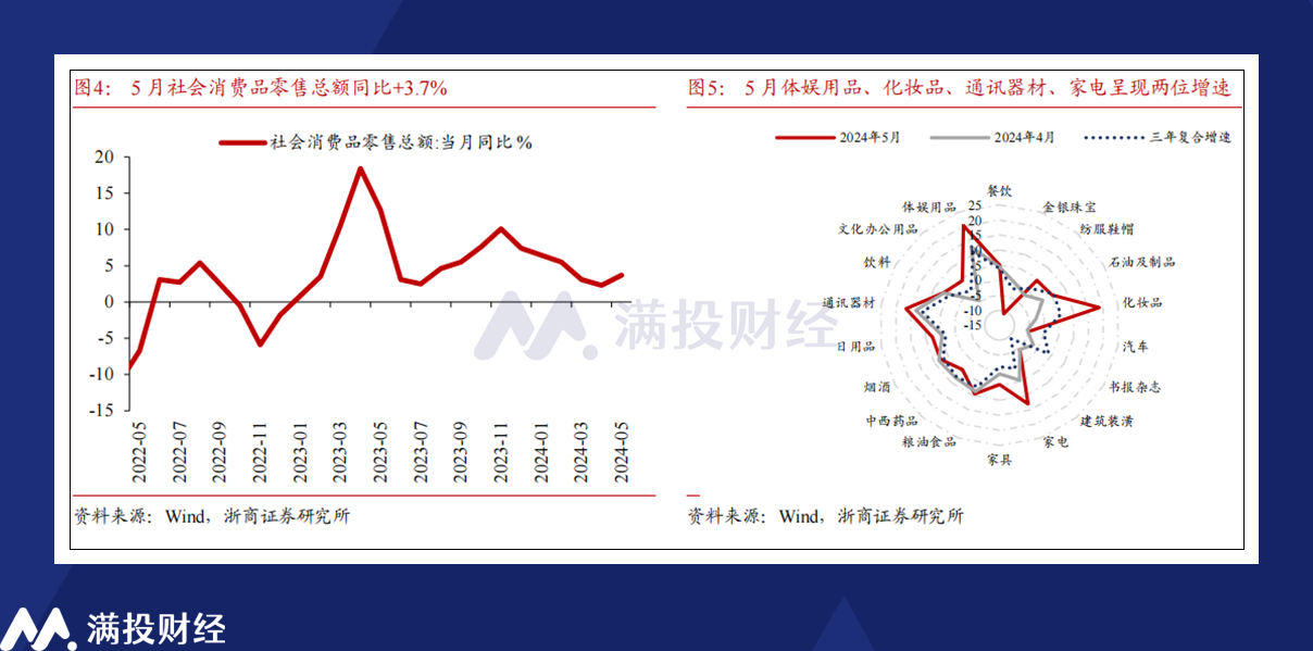 4月政治局会议指出“要积极扩大国内需求,落实好大规模设备更新和消费品以旧换新行动方案”,对促进消费、拉动投资有重要作用。从社零和投资数据来看,政策效应有所显现。同时,培育新质生产力背景下,创新发展、转型升级、绿色转型、民生领域这些方面投资潜力巨大,未来也将对整体投资增速形成较好的支撑。