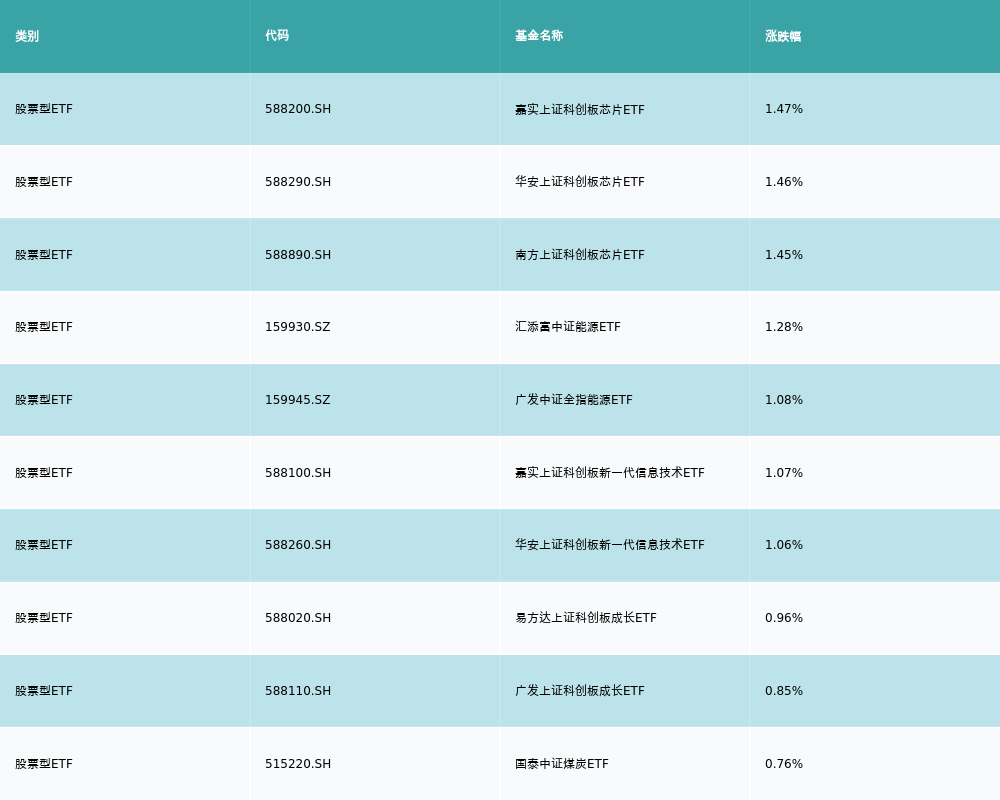昨日股票型ETF涨幅最高的3支ETF及其收益率分别为:嘉实上证科创板芯片ETF(1.47%)、华安上证科创板芯片ETF(1.46%)、南方上证科创板芯片ETF(1.45%)。涨幅前10详情见下表: