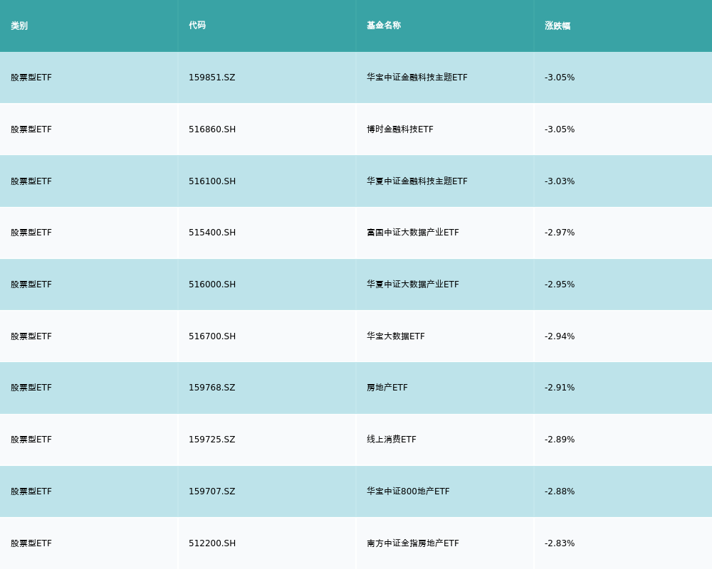 昨日股票型ETF跌幅最大的3支ETF及其收益率分别为:华宝中证金融科技主题ETF(-3.05%)、博时金融科技ETF(-3.05%)、华夏中证金融科技主题ETF(-3.03%)。跌幅前10详情见下表: