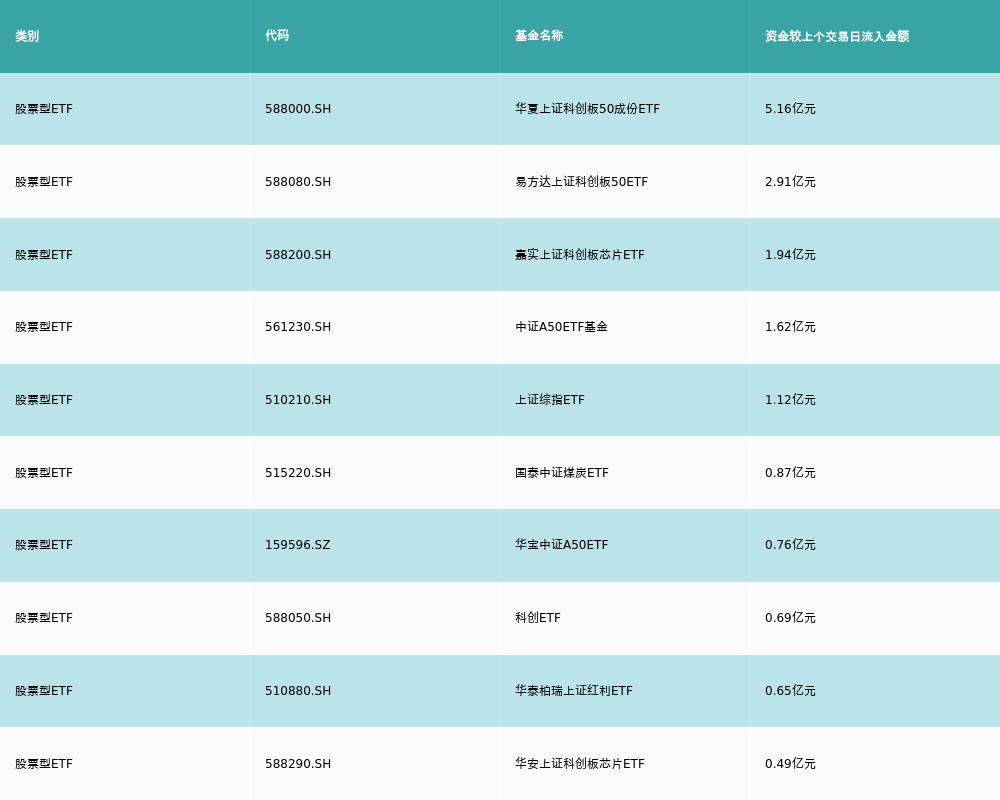 昨日股票型ETF资金流入最多的3支ETF及其流入金额分别为:华夏上证科创板50成份ETF(流入5.16亿元)、易方达上证科创板50ETF(流入2.91亿元)、嘉实上证科创板芯片ETF(流入1.94亿元)。资金流入前10详情见下表: