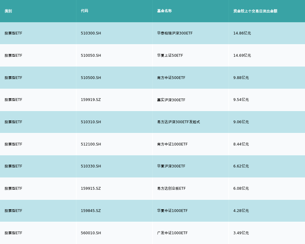 昨日股票型ETF资金流出最多的3支ETF及其流入金额分别为:华泰柏瑞沪深300ETF(流出14.86亿元)、华夏上证50ETF(流出14.69亿元)、南方中证500ETF(流出9.88亿元)。资金流出前10详情见下表: