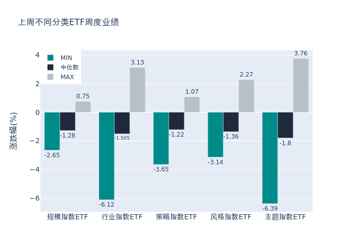 上周股票型ETF周度收益率中位数为-1.47%。其中按照不同分类,规模指数中科创50增强ETF周度收益率最高,为0.75%;行业指数中国泰中证全指集成电路ETF周度收益率最高,为3.13%;策略指数中南方富时中国国企开放共赢ETF周度收益率最高,为1.07%;风格指数中易方达上证科创板成长ETF周度收益率最高,为2.27%;主题指数中嘉实上证科创板芯片ETF周度收益率最高,为3.76%。