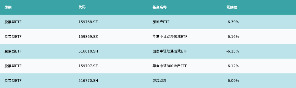 上周股票型ETF跌幅最大的5支ETF及其收益率分别为:房地产ETF(-6.39%)、华夏中证动漫游戏ETF(-6.16%)、国泰中证动漫游戏ETF(-6.15%)、华宝中证800地产ETF(-6.12%)、游戏动漫(-6.09%)。详情见下表: