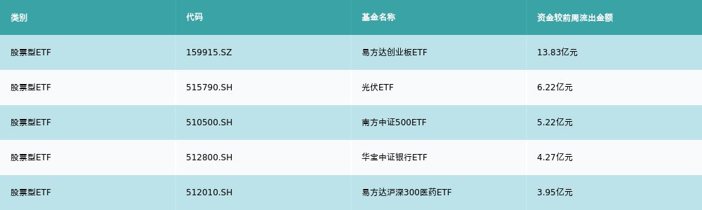 上周股票型ETF资金流出最多的5支ETF及其流入金额分别为:易方达创业板ETF(流出13.83亿元)、光伏ETF(流出6.22亿元)、南方中证500ETF(流出5.22亿元)、华宝中证银行ETF(流出4.27亿元)、易方达沪深300医药ETF(流出3.95亿元)。详情见下表: