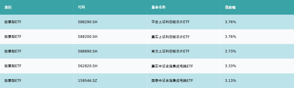 上周股票型ETF涨幅最高的5支ETF及其收益率分别为:华安上证科创板芯片ETF(3.76%)、嘉实上证科创板芯片ETF(3.76%)、南方上证科创板芯片ETF(3.73%)、嘉实中证全指集成电路ETF(3.33%)、国泰中证全指集成电路ETF(3.13%)。详情见下表: