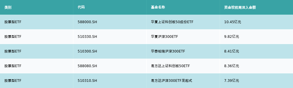 上周股票型ETF资金流入最多的5支ETF及其流入金额分别为:华夏上证科创板50成份ETF(流入10.45亿元)、华夏沪深300ETF(流入9.82亿元)、华泰柏瑞沪深300ETF(流入8.41亿元)、易方达上证科创板50ETF(流入8.36亿元)、易方达沪深300ETF发起式(流入7.39亿元)。详情见下表: