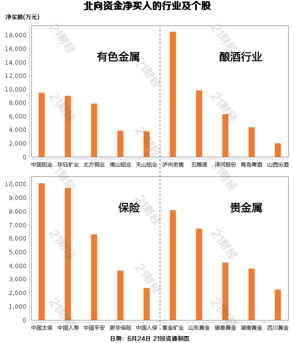 从净买入金额来看,北向资金增持了50个行业,其中有色金属居首,净买入金额达5.01亿元,其次是酿酒行业,净买入3.61亿元。