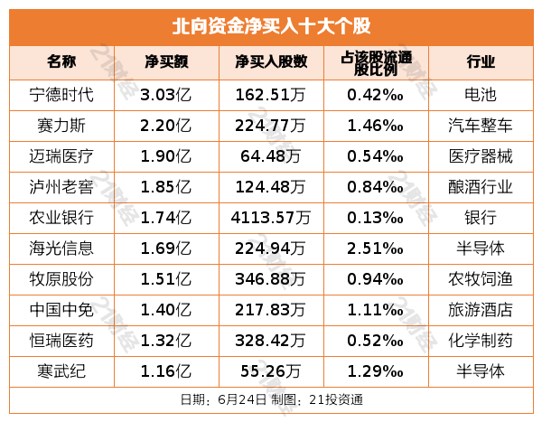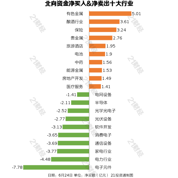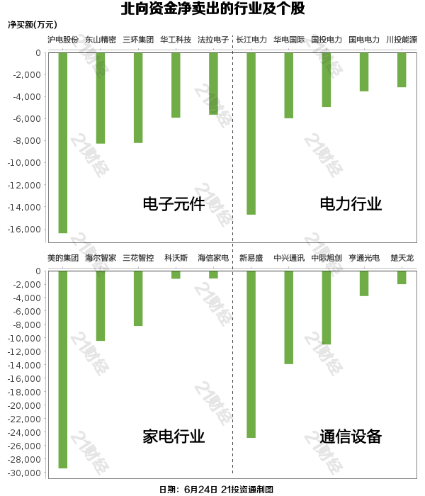 据21投资通智能监测,6月24日,北向资金净卖出4.03亿元,其中沪股通净卖出0.14亿元,深股通净卖出3.89亿元。