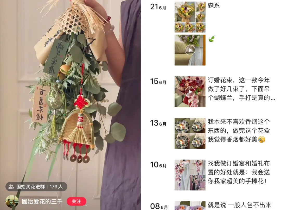 三千的审美积累是在小红书上完成的。她喜欢看欧美花束设计的笔记,尤其是小众审美的花束包装,逐渐形成了自己的风格取向。为了发视频笔记和花束作品,三千学着拍视频、剪视频。她效仿头部成功达人的方式,在家里手举自己设计的花束拍照,进行解读和分享。“我包花是森系和复古风格的,所以在复古风格的家居背景下拍出来很好看。我还喜欢种花,粉丝觉得我对花材比较专业,对生活品质有追求,所以大家认可我的设计,就成为我的粉丝了。”