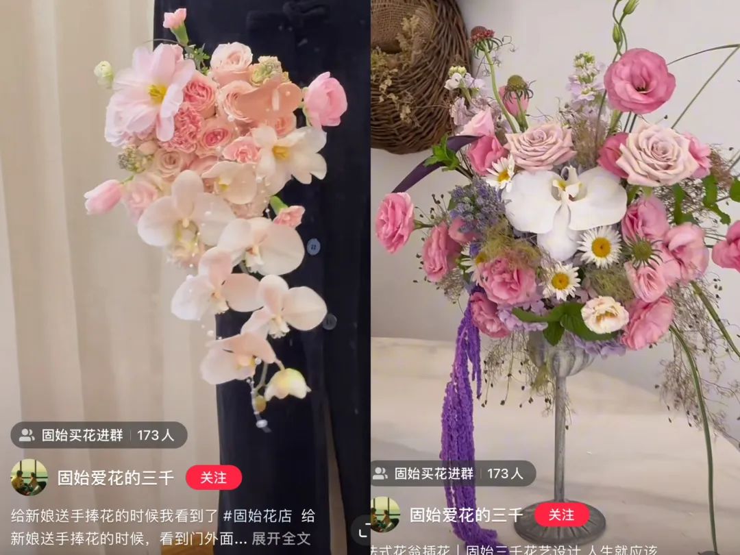 三千的客户大多是同城的女孩,职业以护士、老师、事业编的人为主,因为这些人在县城里属于收入稳定的人群,具备一定的消费能力。但是固始县的花店并不少,甚至可以用“卷”来形容,真正吸引客户一直回购和推荐新客户的因素,就靠作品的审美差异化。“从一开始做花束,我就希望客户收到和他们以前买的花束不一样的风格,打开一看是很惊艳的感觉。”