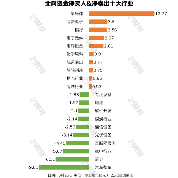 据21投资通智能监测,6月25日,北向资金净卖出33.67亿元,其中沪股通净卖出9.12亿元,深股通净卖出24.56亿元。