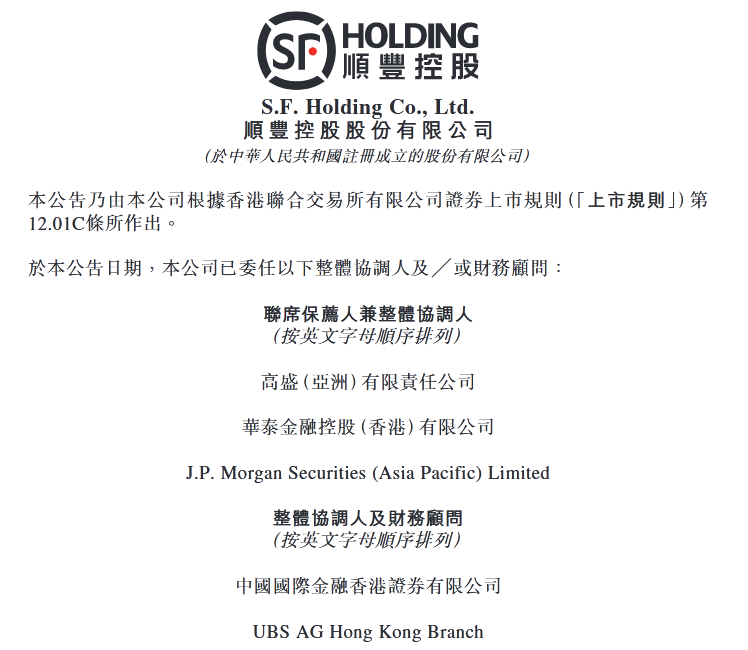 6月28日,香港交易所官网显示,顺丰控股股份有限公司已向港交所递交上市申请书,联席保荐人为高盛(亚洲)有限责任公司、华泰金融控股(香港)有限公司等。