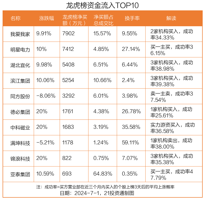 7月1日,上证指数上涨0.92%,深证成指上涨0.57%,创业板指下跌0.04%。盘后龙虎榜数据显示,共有43只个股因当日异动登上龙虎榜,资金净流入最多的是我爱我家(000560.SZ),达0.79亿元。