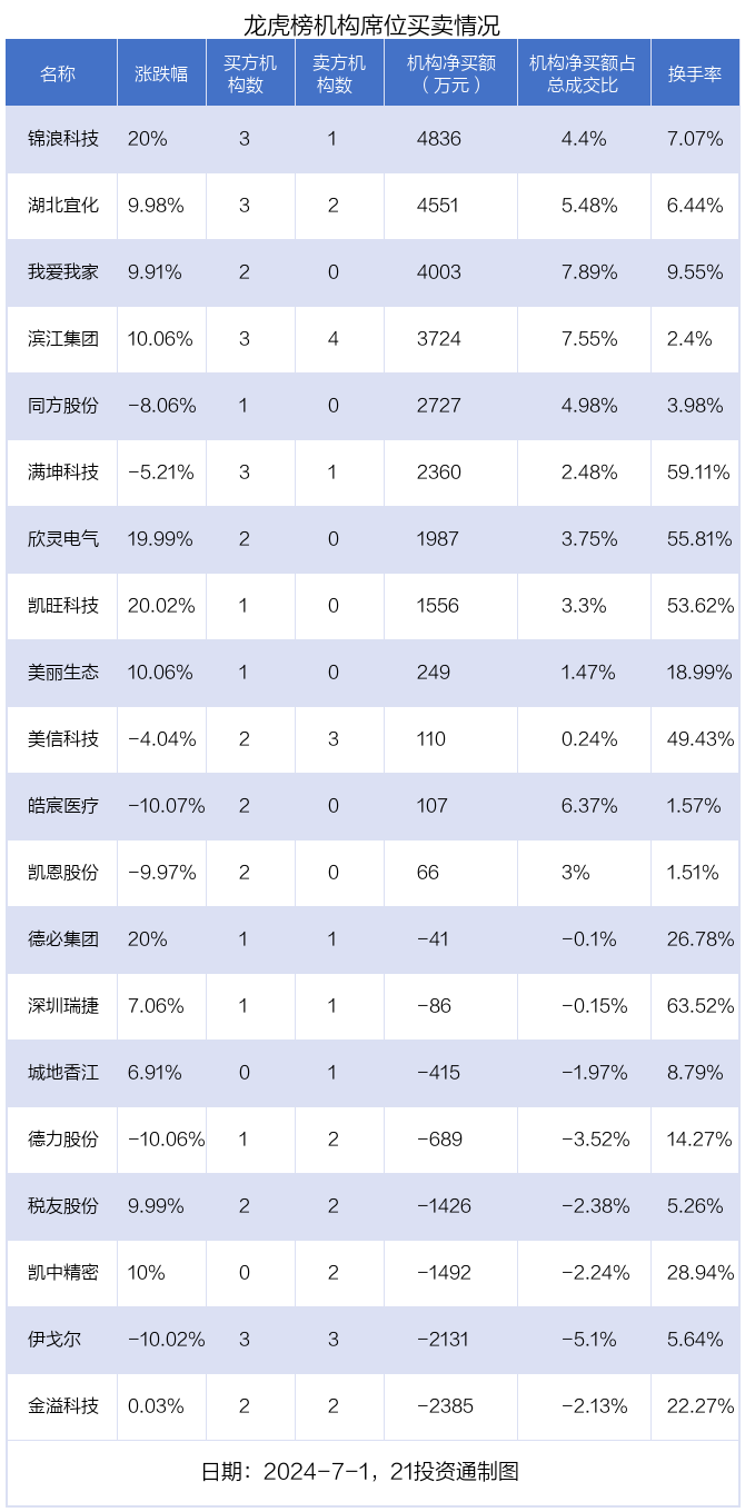 7月1日,20只个股龙虎榜出现了机构的身影,机构合计净买入1.76亿元。具体来看,机构净买入12股,净卖出8股。