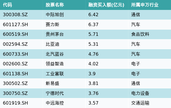 7月1日,两市共有3309只个股有融资资金买入,其中中际旭创、赛力斯、贵州茅台排名前三,买入金额分别6.42亿元、6.37亿元、5.71亿元。融资买入额前10个股详情见下表: