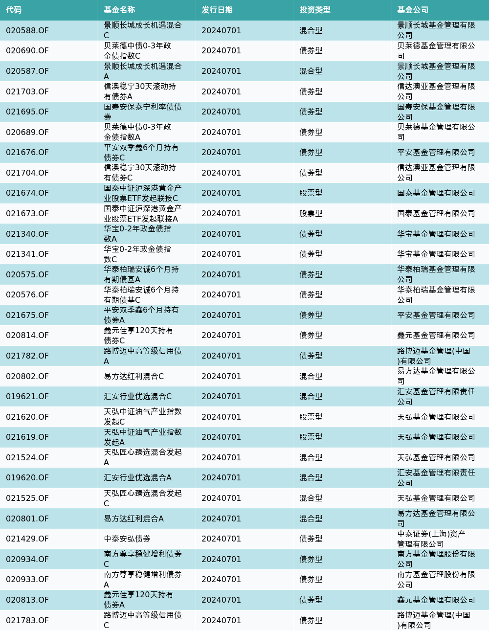 7月1日有30只新基金发行,分别为:景顺长城成长机遇混合C、贝莱德中债0-3年政金债指数C、景顺长城成长机遇混合A、信澳稳宁30天滚动持有债券A、国寿安保泰宁利率债债券、贝莱德中债0-3年政金债指数A、平安双季鑫6个月持有债券C、信澳稳宁30天滚动持有债券C、国泰中证沪深港黄金产业股票ETF发起联接C、国泰中证沪深港黄金产业股票ETF发起联接A、华宝0-2年政金债指数A、华宝0-2年政金债指数C、华泰柏瑞安诚6个月持有期债基A、华泰柏瑞安诚6个月持有期债基C、平安双季鑫6个月持有债券A、鑫元佳享120天持有债券C、路博迈中高等级信用债A、易方达红利混合C、汇安行业优选混合C、天弘中证油气产业指数发起C、天弘中证油气产业指数发起A、天弘匠心臻选混合发起A、汇安行业优选混合A、天弘匠心臻选混合发起C、易方达红利混合A、中泰安弘债券、南方尊享稳健增利债券C、南方尊享稳健增利债券A、鑫元佳享120天持有债券A、路博迈中高等级信用债C,详情见下表: