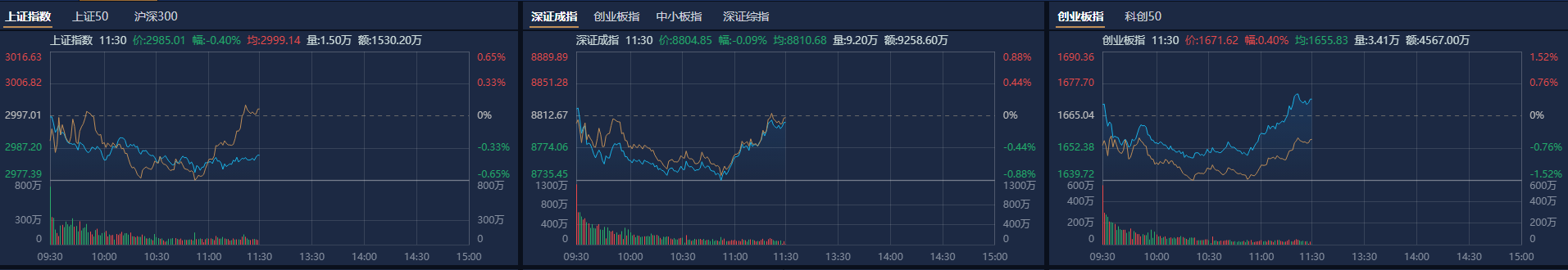 市场早盘震荡分化,创业板指探底回升,沪指震荡调整。南财金融终端显示,截至收盘,沪指跌0.4%,深成指跌0.09%,创业板指涨0.4%。总体上个股跌多涨少,全市场超2900只个股下跌。