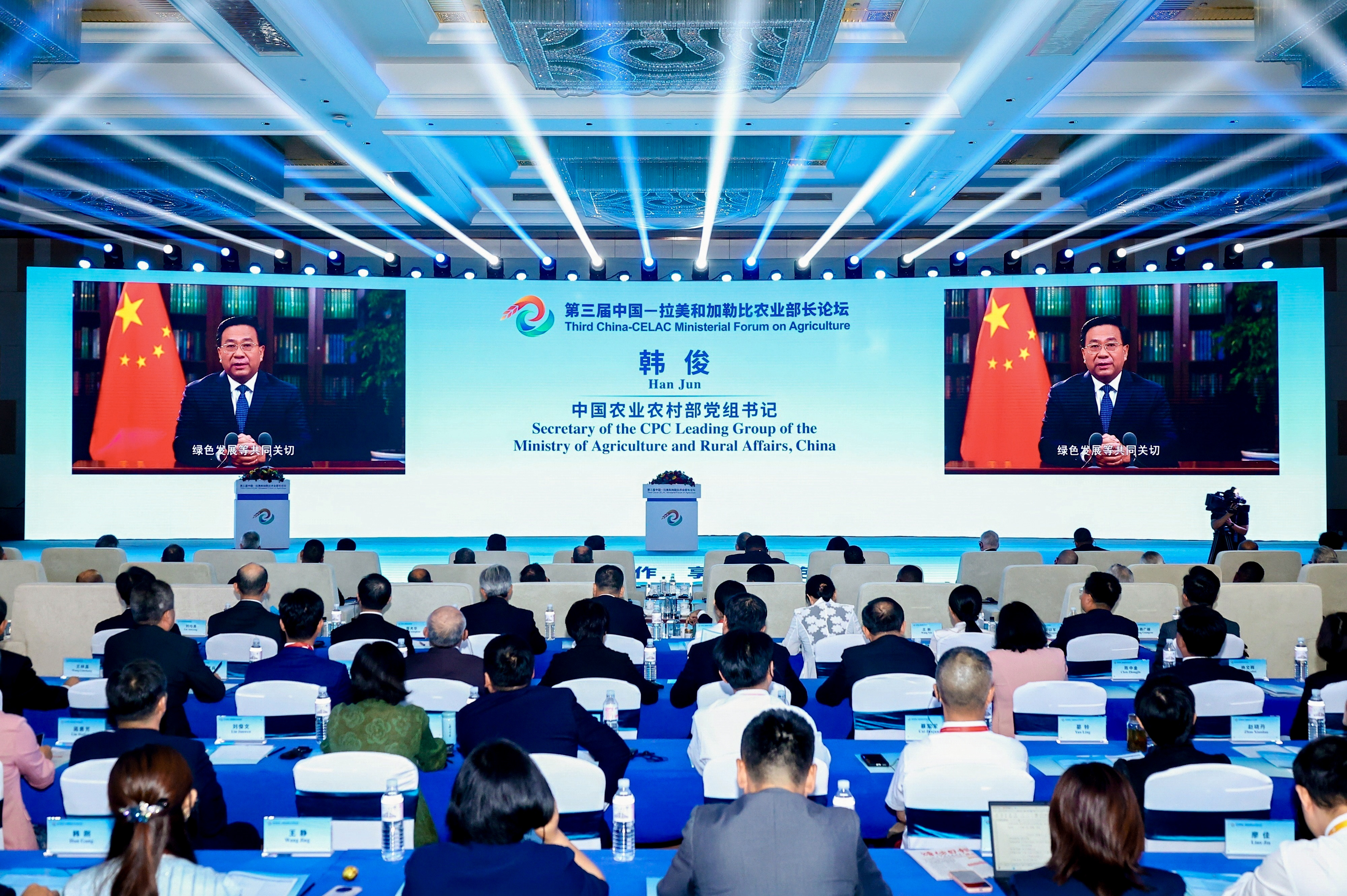 韩俊在致辞中表示,习近平主席十年前同拉美国家领导人历史性会晤以来,中拉农业合作取得丰硕成果。中拉农业部长论坛机制不断深化,中国与19个拉共体国家建立双边农业合作机制;农业经贸快速增长,农业机械化、新品种选育推广、水稻生产等领域合作不断深化,2023年中拉农产品贸易额达到810多亿美元,比2014年翻了一番;在粮食安全、绿色低碳、贸易便利化等议题上高度协同,共同发出了“中拉强音”。