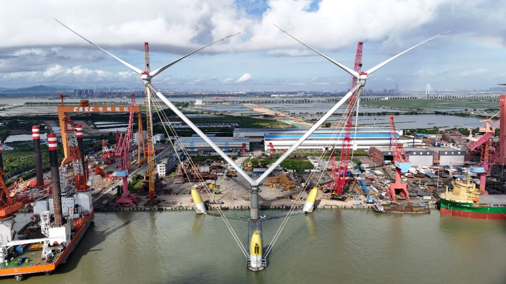 风力发电机在深远海“安身立命”的关键就是漂浮式基础。“明阳天成号”的“Y”字型漂浮式基础长117米,宽105米,高39.5米,全球首次采用超高性能混凝土浇筑而成,相比海洋工程中常见的钢结构成本更低,强度是普通混凝土的4倍左右,既有钢结构的承载能力,还有耐腐蚀、密封性好等优势,非常适合深远海风电场建设。
