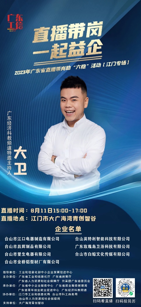 2023年广东省直播带岗助“六稳”活动由工业和信息化部中小企业发展促进中心指导,广东省工业和信息化厅、广东省教育厅、广东省人力资源和社会保障厅及共青团广东省委员会共同主办,广东省中小企业服务中心、广东省就业服务管理局、广东省青年创业就业促进中心以及广东经济科教频道共同承办。