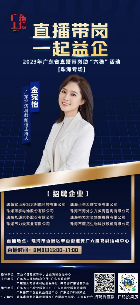 2023年广东省直播带岗助“六稳”活动由工业和信息化部中小企业发展促进中心指导,广东省工业和信息化厅、广东省教育厅、广东省人力资源和社会保障厅及共青团广东省委员会共同主办,广东省中小企业服务中心、广东省就业服务管理局、广东省青年创业就业促进中心以及广东经济科教频道共同承办。