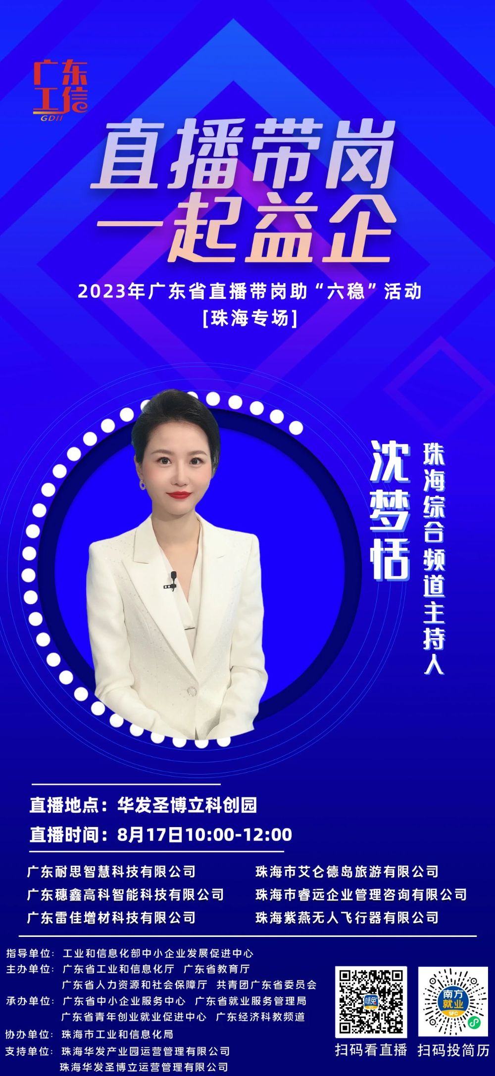 2023年广东省直播带岗助“六稳”活动由工业和信息化部中小企业发展促进中心指导,广东省工业和信息化厅、广东省教育厅、广东省人力资源和社会保障厅及共青团广东省委员会共同主办,广东省中小企业服务中心、广东省就业服务管理局、广东省青年创业就业促进中心以及广东经济科教频道共同承办。