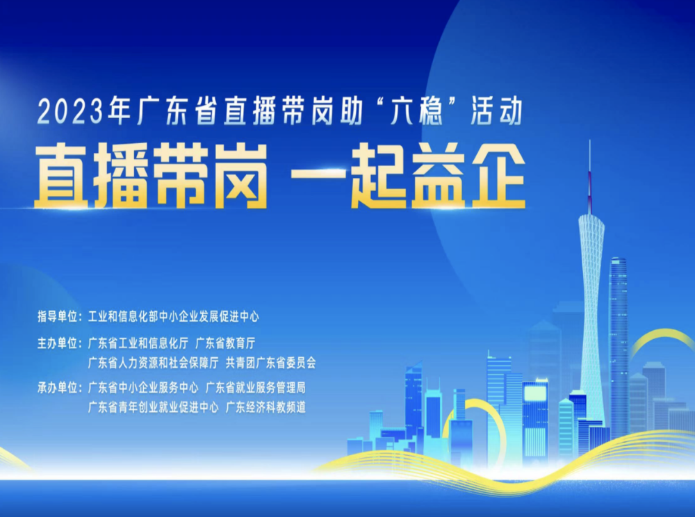 2023年广东直播带岗助“六稳”启动仪式由工信部中小企业发展促进中心指导,广东省工信厅、省教育厅、省人社厅及团省委共同主办,省中小企业服务中心、省就业服务管理局、省青年创业就业促进中心以及南方财经全媒体集团、广东广播电视台经济科教频道共同承办。